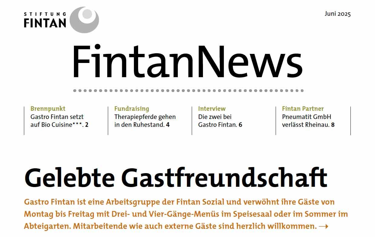 Erleben, was uns bewegt und wer uns bewegt. Die FintanNews erzählen von den vielen kleinen Dingen, die das Fintanland zu einem ganz besonderen Ort machen. In der aktuellen Ausgabe sind das ein Blick hinter die Kulissen unserer Küche, Stimmen unserer langjährigen Mitarbeitenden, Einsicht in den Alltag unserer Therapiepferde und vieles mehr.